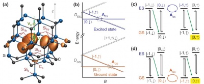 Working together with Professor Awshalom's group we demonstrate optically pumped dynamic nuclear polarization of 29Si nuclear spins that are strongly coupled to paramagnetic color centers in 4H- and 6H-SiC. The 99%1% degree of polarization that we observe at room temperature corresponds to an effective nuclear temperature of 5 K. By combining ab initio theory with the experimental identification of the color centers’ optically excited states, we quantitatively model how the polarization derives from hyperfine-mediated level anticrossings. These results lay a foundation for SiC-based quantum memories, nuclear gyroscopes, and hyperpolarized probes for magnetic resonance imaging. The study is featured in Physics and highlighted as Editor's suggestion in PRL.